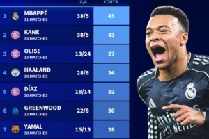 本赛季参与进球榜:姆巴佩、凯恩43球,哈兰德、青木、亚马尔在列体育资讯2月10日讯《转会市场》也统计了五大联赛球员本赛季各项赛事参与进球情况,姆巴佩和凯恩43球并列最多。本赛季五大联赛球员各项赛事参与进球榜:1.姆巴佩(皇马),31场,38球+5助攻=43球2.凯