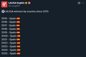 西甲官推整活调侃超级碗:西班牙包揽了2015年至今的所有西甲冠军体育资讯2月9日讯西甲官推今日发文,调侃了超级碗。数据账号WorldofStatistics今日发文,表示美国赢得了2000年至今的每一届超级碗。由于超级碗是NFL总决赛,NFL又是美国橄榄球联盟,因此