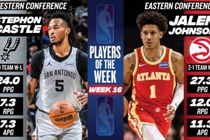 周最佳:卡斯尔率队3胜0负场均24分 新鹰王场均27.3分12板11.3助体育资讯2月10日讯今日NBA官方宣布,马刺后卫斯蒂芬·卡斯尔和老鹰前锋杰伦·约翰逊分别被评本赛季第16周西部和东部周最佳球员。上周卡斯尔率队取得了3胜0负的战绩,场均可以得到24分7.3篮板7.3助攻