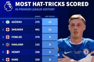 英超历史戴帽榜:阿圭罗12次、希勒11次,哈兰德8次、帕尔默4次体育资讯2月10日讯切尔西在本轮英超3-1击败狼队,帕尔默上演帽子戏法,《转会市场》统计显示帕尔默已经在英超4次戴帽,位列联赛历史第16位。英超历史戴帽榜:1.阿圭罗,275场,12次2.希勒,441场
